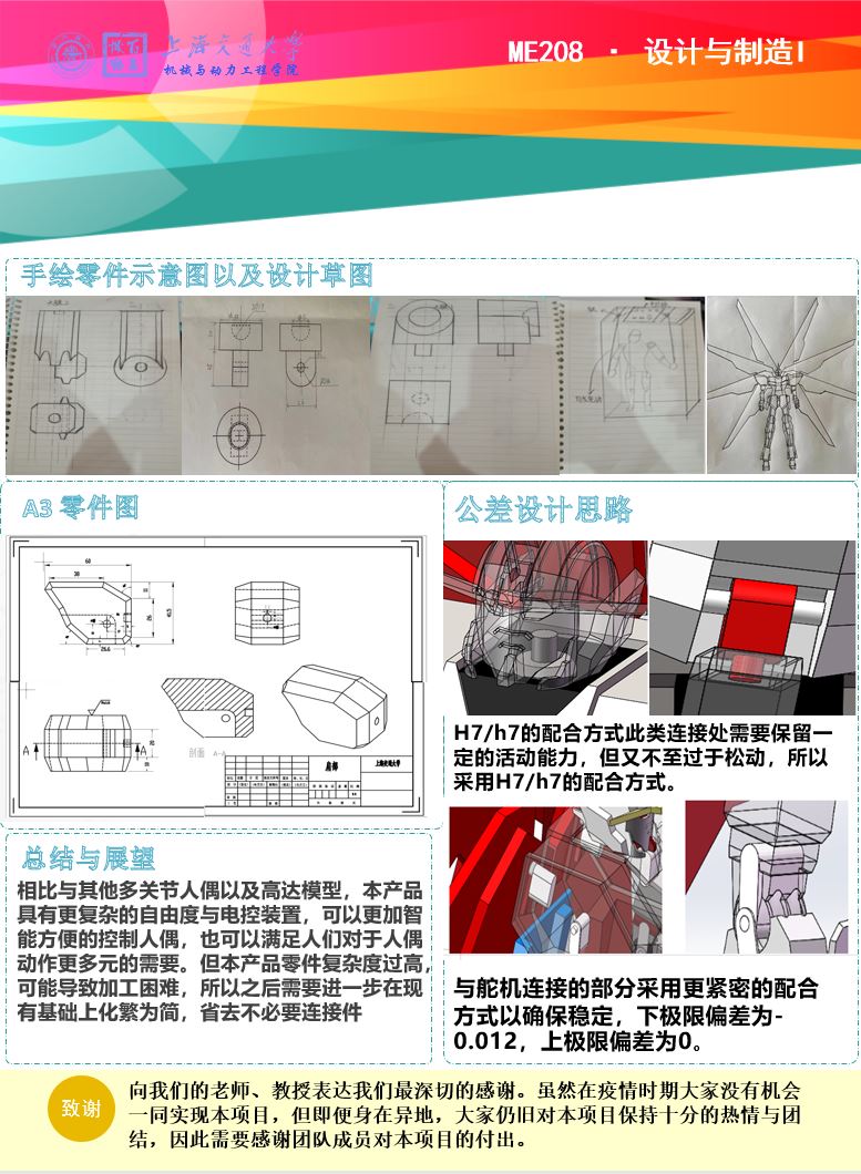 本项目基于多关节人偶,希望打造出一种能够寓教于乐的玩具,丰富人们的生活,经过最终的讨论,我们决定将其设计成高达模型的外形,并对其关节处进行精妙设计,使其能够根据需求做出不同的动作。在实现的过程中,小组成员积极讨论,修改模型,优化设计,才完成了最后的成品。相比与其他多关节人偶以及高达模型,本产品具有更复杂的自由度与电控装置,可以更加智能方便的控制人偶,也可以满足人们对于人偶动作更多元的需要。