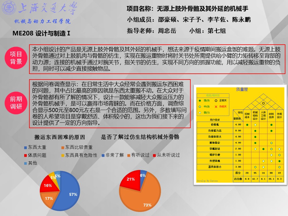通过问卷调研发现日常生活中大众经常会遇到搬运东西困难,特殊时期也会遇到接触污染的风险。为解决这些问题,本小组提出无源上肢外骨骼及其外延的机械手项目。项目目标是满足减轻搬运重物的负担以及减少直接接触物品的需求:减轻搬运重物的负担这一功能旨在解决搬运水桶、行李箱上下楼,疫情期间搬运物资及相似问题;减少直接接触物品这一功能旨在解决疫情期间搬运物资的同时避免污染物资、保护自身安全,抓握有毒有害的化学品或有一定放射性的污染物。此外,产品应尽可能保证产品质量可靠,制造成本低以及使用安全。