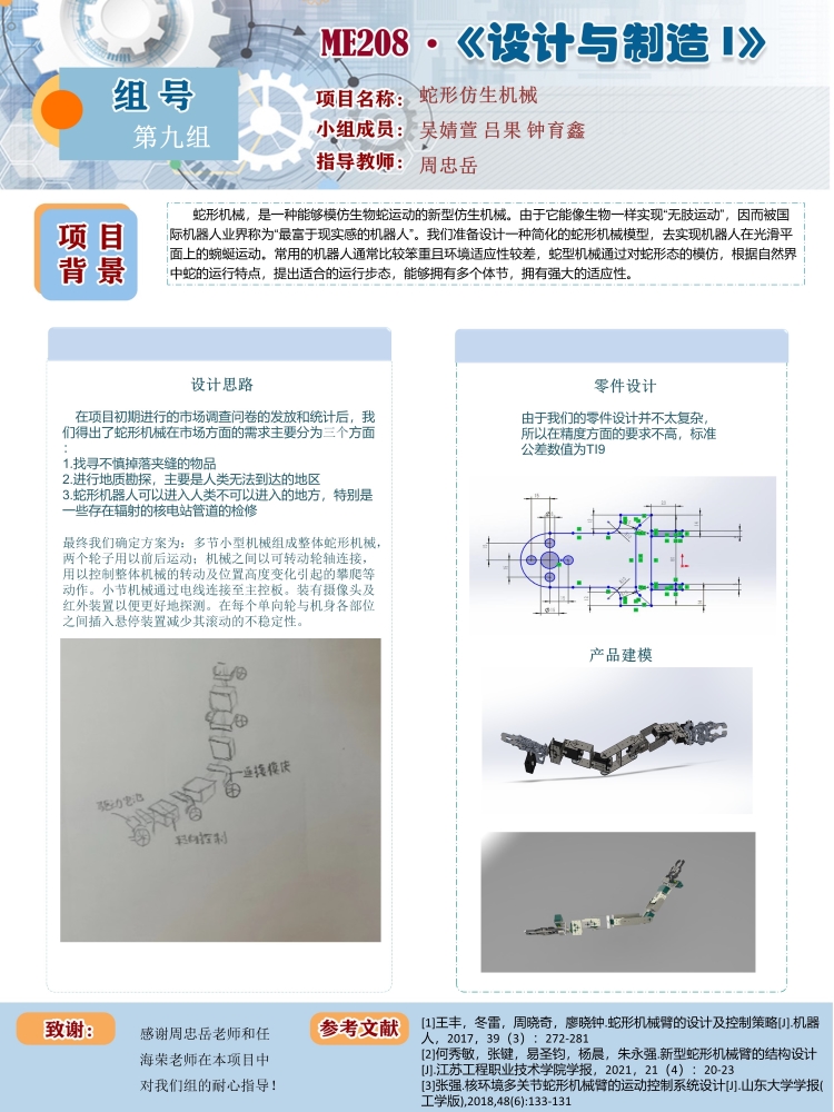 我们组的项目是蛇形仿生机械。机械整体为多节小型机械组成整体蛇形机械,两个轮子用以前后运动;机械之间以可转动轮轴连接,用以控制整体机械的转动及位置高度变化引起的攀爬等动作。小节机械通过电线连接至主控板。装有摄像头及红外装置以便更好地探测。在每个单向轮与机身各部位之间插入悬停装置减少其滚动的不稳定性。设计的重点主要放在细长形状和便于控制两项易于实现且需求较高的特性上,其余的或多或少由于技术不到位暂时无法实现。由于技术原因我们没有使用电源,但是可以作为后续考虑问题。