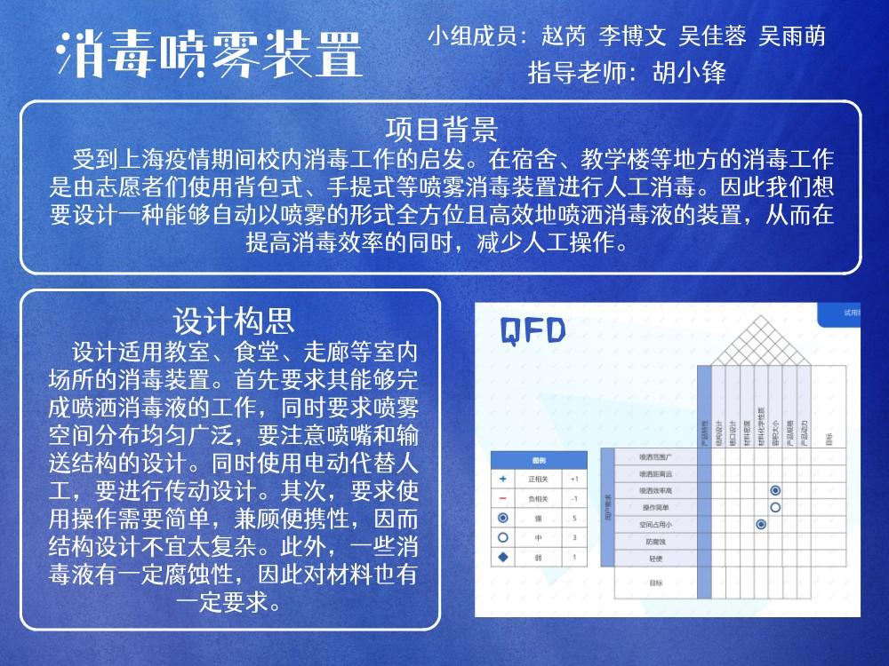 我们受到上海疫情期间校内消毒工作的启发,想到关于使用消毒喷雾消毒的问题。宿舍、教学楼等地方的消毒工作是由宿管阿姨、清洁阿姨或志愿者使用背包式、手提式等喷雾消毒装置进行人工消毒,这种方式一方面消耗人力耗费时间,另一方面增加了人与环境的接触,增大受感染的风险。我们想要设计一种装置,使其能够自动以喷雾的形式全方位且高效地喷洒消毒液,从而在提高消毒效率的同时,减少人工操作。于是我们设计了这一款适用于教室、宿舍走廊等室内环境的喷雾消毒装置。