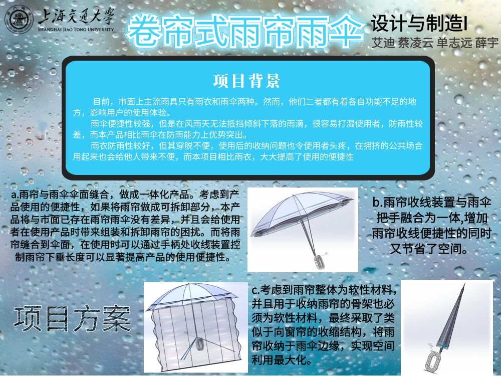 本项目旨在研发一种新型雨伞:卷帘式雨帘雨伞。当前市面上的雨具主要分为两种,雨伞和雨衣。雨衣的防雨性能较强,但缺点是穿戴不够便捷;雨衣使用方便,但如果雨势较大时,依然会出现淋湿身体的问题。本项目研发的卷帘式雨帘雨伞,可以在需要时,放下固定在雨伞外圈的雨帘,包围住使用者,从而加强雨伞的防雨性,同时又能保证雨伞使用的便捷性,提高使用者雨天出行的舒适度。