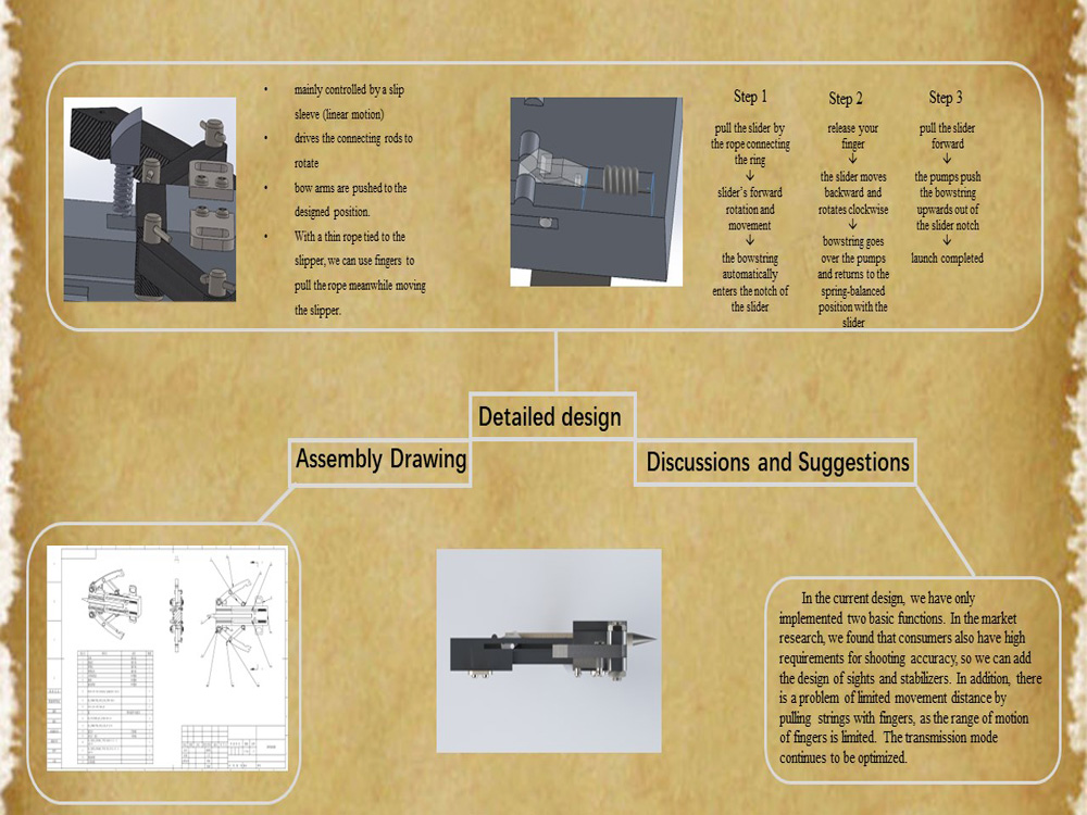 在设计上,项目有较高的完成度,各零件结构、材料、加工方式、组装方式都已经确定。项目的最终设计可以实现便于隐蔽、单手操作等目标,模型操作简单,只需要用手指拉动拉线带动相应零件运动即可。且加工方式都较为简便,易于实现。