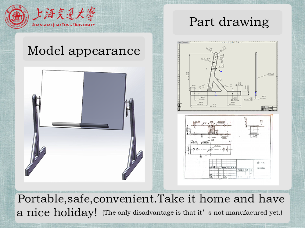 该产品目前已经实现床上支架的功能,架起后整体能够在前后移动,主板的位置可以在距放置面20cm至35cm处调整,安全角度支持与铅锤面夹角-30°~60°,最大可放置电脑体积为50cm×40cm×10cm。产品可拆卸,拆卸后在宽度上几乎不占据空间,仅在长度上有空间占用需求,可以贴墙放置或平躺放置。角度调节通过阻尼合页实现,用手转动主板即可停在任意角度;高度调节通过螺栓固定,需要手动拆卸和组装,高度调节区间为20cm、24cm、28cm、32cm。