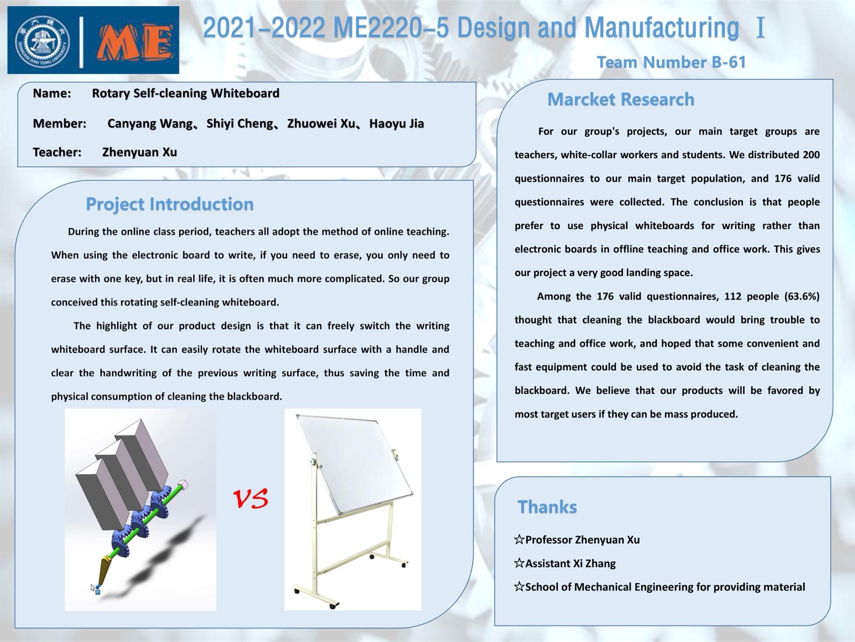 The epidemic of COVID-19 makes it impossible for us to build a prototype. The final result of our project is a 3D solidworks model. The 3D solidworks model is made up of four main parts: rotation shaft, gears, handle and white board (rotating unit). The 3D model is able to simulate the main function of our design. When we twist the handle of the model in solidworks, the white board rotates as well. Gears are the key to the driving structure. Every rotating unit is connected to a gear, and the rotation shaft is connected to gears as well. The movement of three pairs of “umbrella gear” help to transit the movement of the handle. However, there still exist something to be optimized, such as the ratchet and the cleaning structure. The application of ratchet helps to held the rotation unit in place, so that the white board will not rotate when the teacher is writing. The cleaning structure is supposed to be passive. Passive structure will cause zero carbon emission and cause much lower noise than electric motor. In our schedule drawing, we show the element of “self-cleaning white board” in detail, include measurement, screw thread, manufacturing tolerance, and so on.
