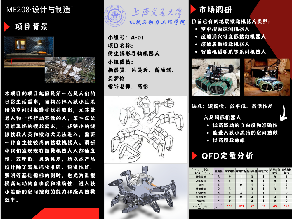 本项目的项目起因第一点是人们的日常生活需求,当物品掉入狭小且黑暗的空间时很难寻找并取出,尤其是对于老人和一些行动不便的人,第二点是灾难现场的搜救需求,一些狭小的缝隙搜救人员和搜救犬无法进入,需要一种自主性较高的搜救机器人。调研中我们发现搜救机器人大都速度慢、效率低、灵活性差,所以在结合了小组成员的讨论成果和任课教师的帮助后,本产品目标是设计并制造一款拥有蝎子外形的六足机器人,前置机械抓手用以抓物,后置花瓣外壳包裹的照明和摄像装置;设计除了需要满足抓物准确、稳定性好、照明等基础指标的同时,也尤为重视提高运动的自由度和准确性、进入狭小黑暗的空间搜救的能力和提高搜救效率。