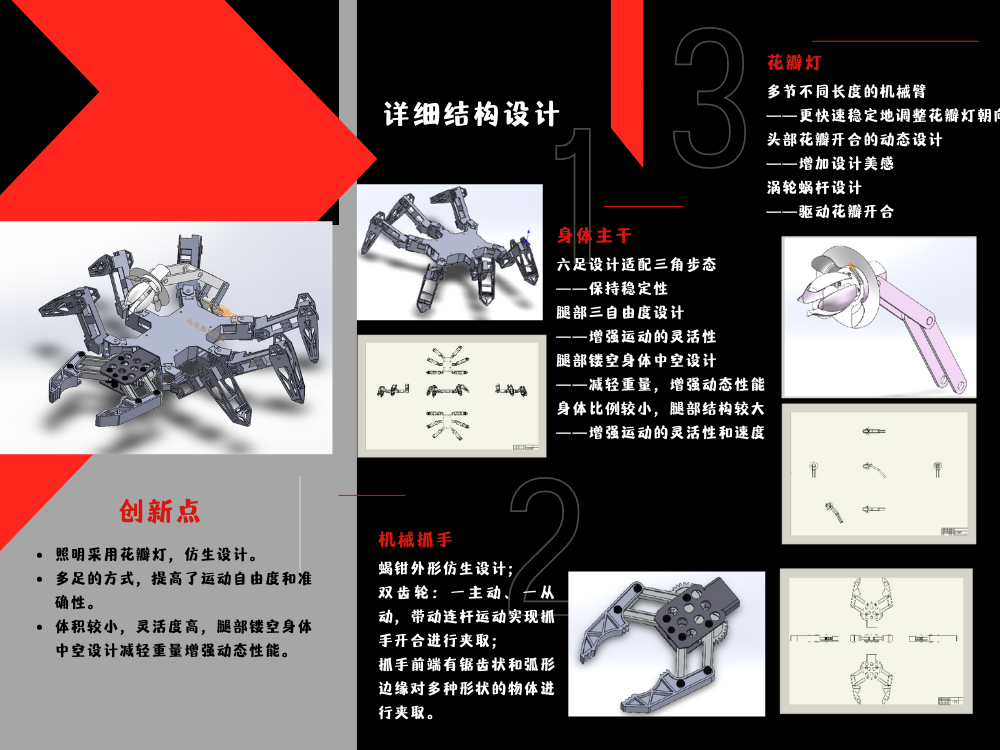 本项目组设计了一款仿生蝎形寻物机器人,包含三个子系统:用于准确夹物的机械抓手系统、可以利用六足灵活移动的步进移动系统和利用花瓣开合照明的灯光照明系统。项目结构精巧,腿部三自由度实现了姿态灵活调整,锯齿边缘的弧形抓手保证了夹物的稳定性;整体重心稳定,偏低的底盘与纤长的腿部对此加以保证;步态轻盈,六足适配三角步态另起健步如飞,能够在保证灵活快速移动的同时实现照明探测,并利用稳定灵敏的抓手准确夹物。未来,结合红外探测、摄像记录、娱乐部件的完善,全自动探测寻物兼具娱乐功能的机器人将成为其亮眼的标签。