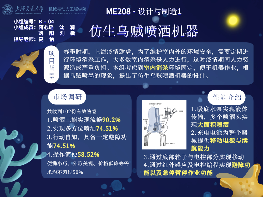 春季时期,上海疫情肆虐,为了维护室内外的环境安全,需要定期进行环境消杀工作,大多数室内消杀是人力进行,这对疫情期间人力资源造成严重负担。本组考虑到室内消杀环境固定,便于机器作业,由此根据乌贼喷墨的现象,提出了仿生乌贼喷洒机器的设计。吸底水泵实现液体传输,多个喷洒头实现大面积喷洒,充电电池为整个器械提供移动电源与续航能力,通过底部轮子与电控部分实现移动,通过红外感应及电控编程实现避障功能以及急停暂停作业功能。