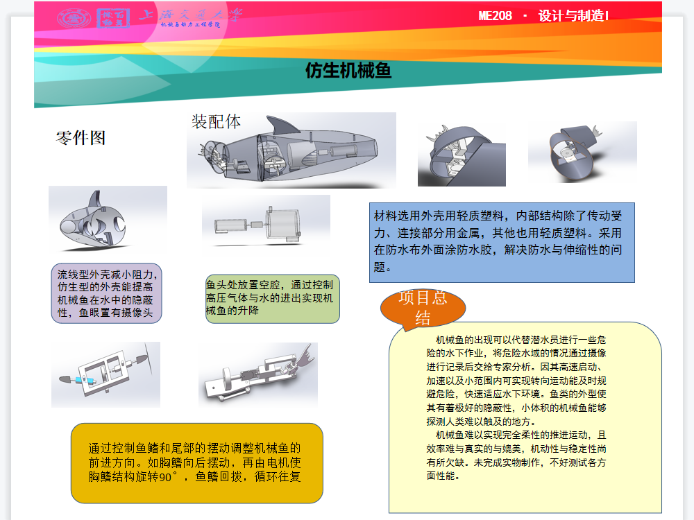 我们采用流线型外壳减小阻力,且仿生型的外壳能提高机械鱼在水中的隐蔽性,鱼眼置有摄像头,可以实现避开障碍物和对水下状况的观测,鱼头处放置高压气舱与水舱,利用电磁阀控制高压气体与水的进出水舱实现机械鱼的升降,通过控制胸鳍和尾部的摆动调整机械鱼的前进和转向,如胸鳍向后摆动,再由电机使胸鳍结构旋转90°,鱼鳍回拨,循环往复;同时胸鳍的上下摆动也可辅助升降。材料除了传动受力、连接部分用金属,其他包括外壳部分均采用轻质塑料。电路和板子均用防水材料包裹,制作手机app利用蓝牙对机械鱼进行远程操控。