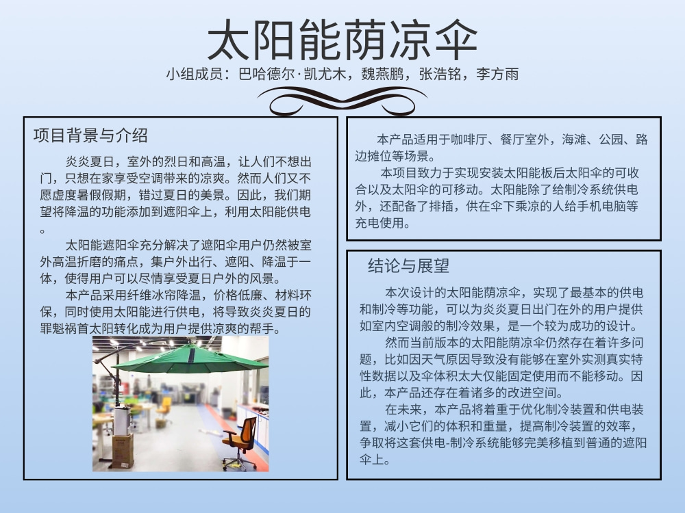 本项目为太阳能制冷研究积累了宝贵经验,为后续改进遮阳伞和研发便携性太阳能制冷伞提供了经验,指引了改进和研究方向。