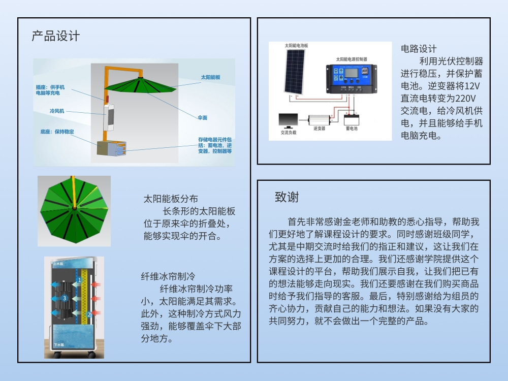 太阳能发电方面,找到了适合做伞面的轻柔的太阳能材料,设计出了可折合,结构稳定,满足功率要求的太阳能伞面。蓄电供电上,设计了合理的电路结构,选择了合理的电器元件。冷风机方面,通过研究多种制冷方式,最终选择了“水冰帘制冷”(又称水空调)方案提供冷风,设计并最终购买了价格合理,满足需求的冷风机。