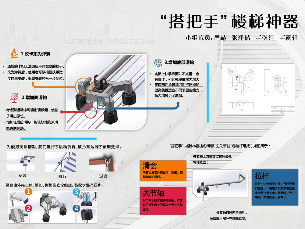 本项目设计的 “杠杆型”上下楼梯搬运重物时的新型辅助机械装置以夹持在楼梯扶手上的滑套为可滑动支点,铝制金属拉杆为抬杠,借助杠杆原理将无装置辅助的分段式垂直抬升重物的过程转化为沿扶手斜面均匀拖动重物的过程。本项目难点在于如何使滑套在楼梯扶手转弯处顺畅滑动。本项目组设计了一种三角形布局的“鹰爪”型可伸缩式滑套。通过对着种新型滑套结构进行运动仿真分析和受力应变仿真分析,本项目组验证了这种滑套结构在运动功能和强度上的完全可行性。