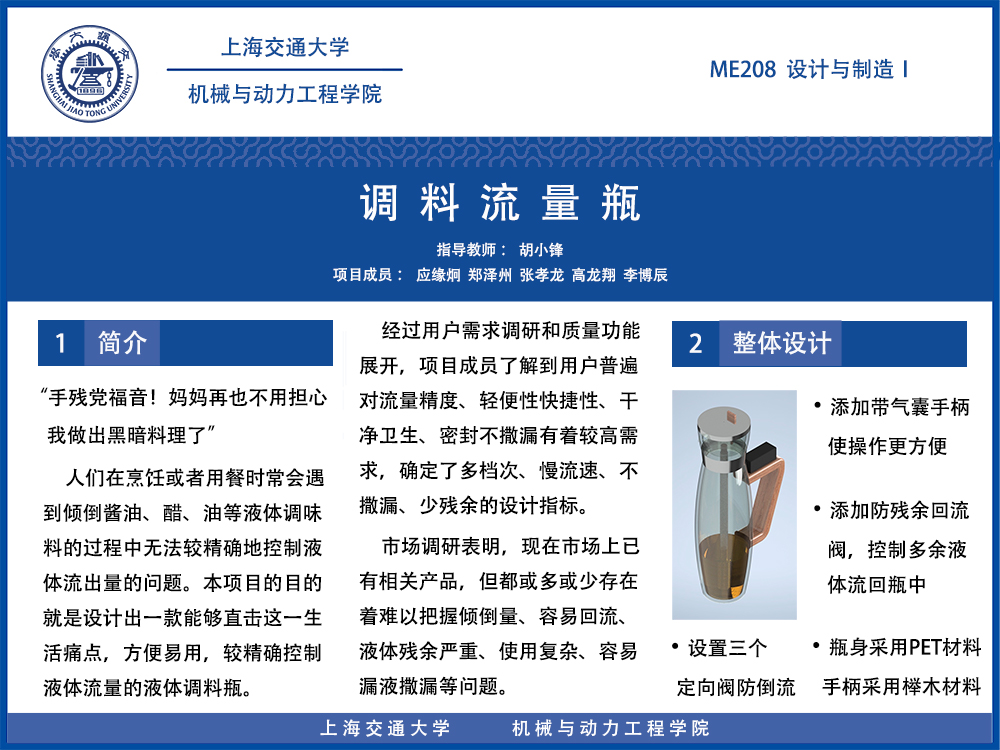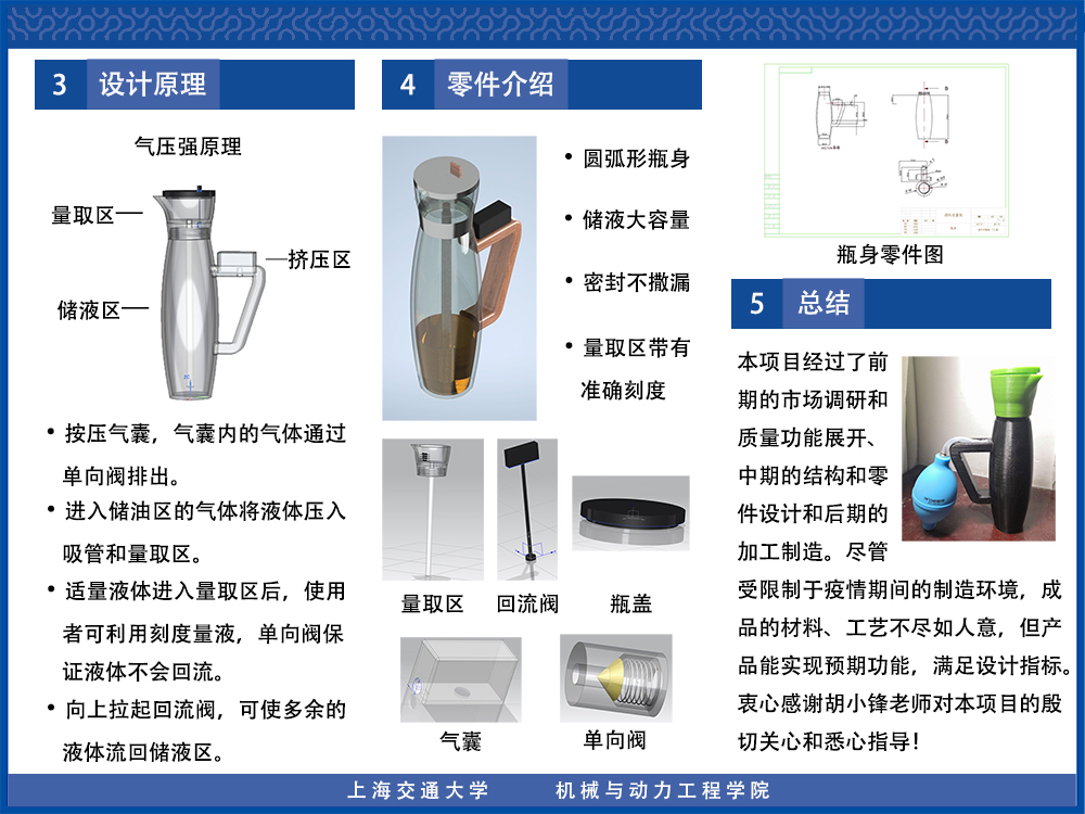 通过客户需求调研、市场产品调查、质量功能展开等过程,本产品被设定为一款外形、重量和材料与普通流量瓶相似、流速缓慢、不宜撒漏、残余较少的能够精确控制液体流出量的调料瓶。在选定产品的核心原理为其压强原理之后,我们还在市面已有产品的基础上作出改动:1.为瓶子添加手柄,且将气囊置于手柄上,更有利于操作的方便性。2.添加回流阀,使得未倾倒完的液体可以流回瓶中。3.设置三个定向阀,确保气体与液体流动的单向性,防止倒流。3.改进材料,瓶身均采用轻质PET材料,手柄使用榉木材料。