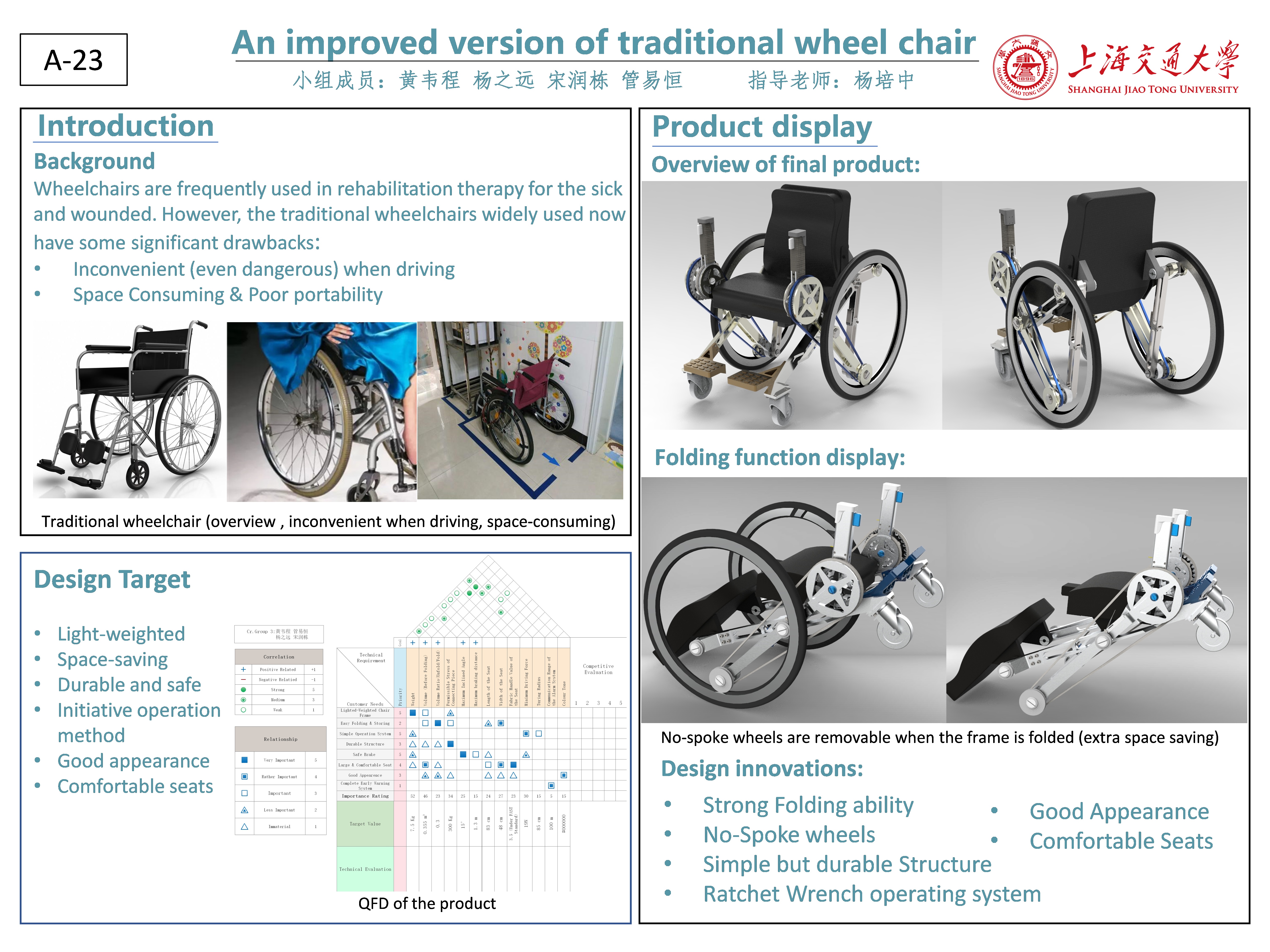 This project plans to design an improved version of the traditional wheelchair. After trial and error, the team successfully optimized the wheelchair’s power system, wheels and chair-frame. Meanwhile, the wheelchair’s appearance is fully considered to ensure the sense of design.