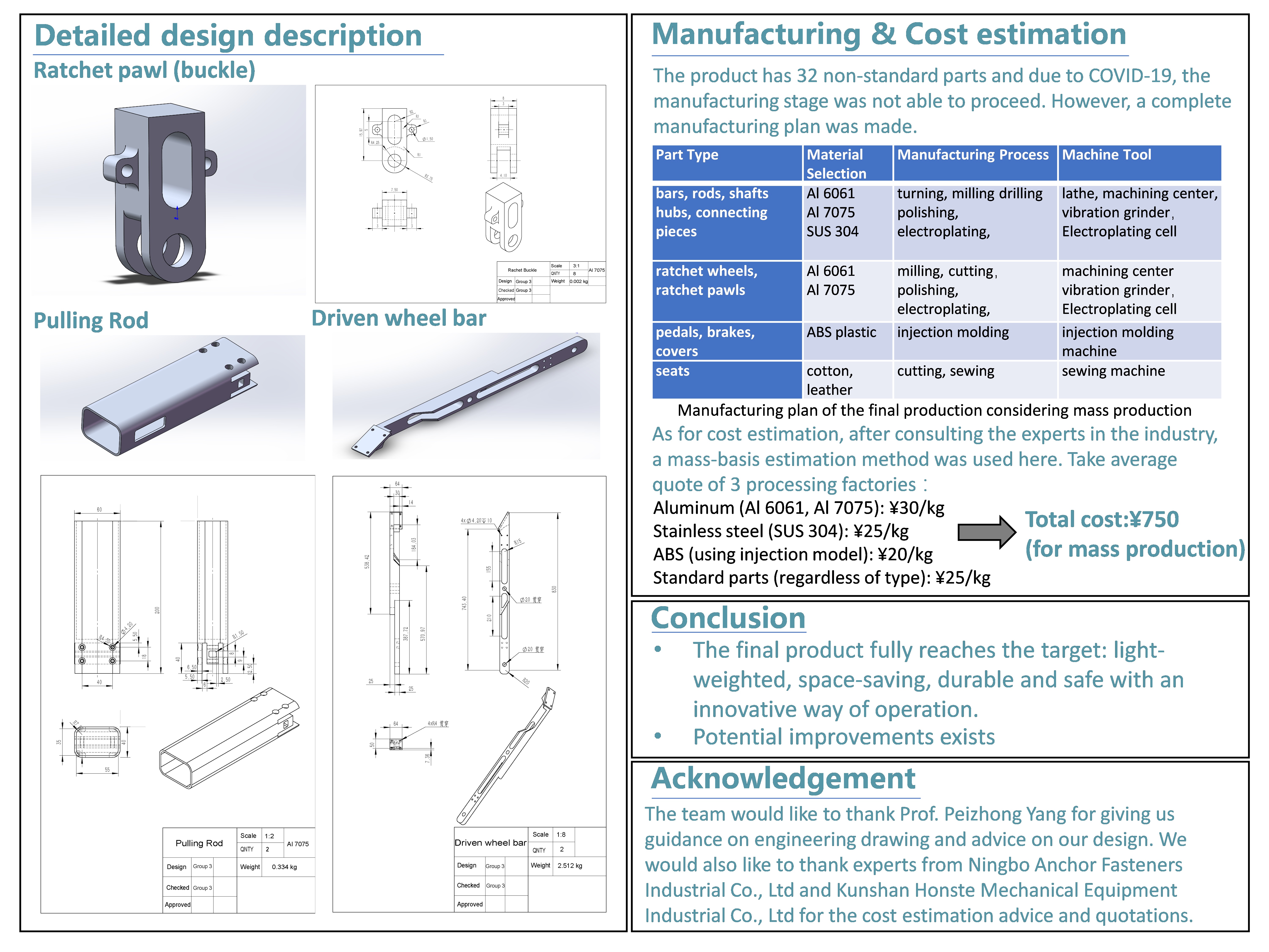 Materials of the basic parts were selected to minimize the weight. Some of the bars and rods were also hollowed out for the lighted-weighted concern. The total mass of the wheelchair is 20kg and the appearance is satisfying.