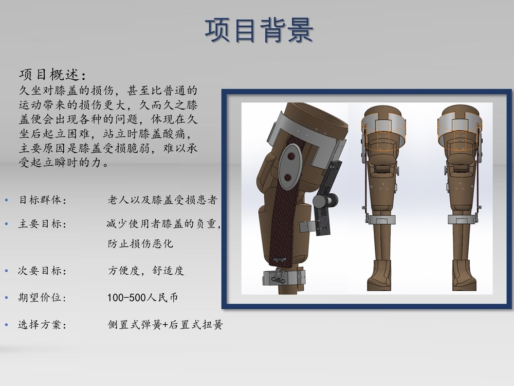 针对膝盖辅助器的设计问题,我们的初步构思是在实现辅助膝盖省力的前提下,使其尽量方便日常生活的使用。此外,根据进行问卷调查,受访者对于膝盖辅助装置的功能期待由高到低分别为:帮助膝关节恢复、减轻膝关节压力;稳定髌骨、减轻压力;保护肌腱、避免牵拉;延缓膝关节退化、帮助消减不适。但是大部分受访者表示在了解膝关节保护的重要性之后愿意购买与使用相关辅助装置。根据调查问卷确定用户的主要需求在于膝盖辅助器的舒适性,日常生活的便捷性和切实有效的辅助效果上,对于价格方面并不敏感,期望中的膝盖辅助价位为100-500人民币。