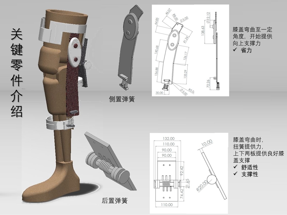 通过侧置弹簧与后置弹簧的相互配合,一个线性力,一个非线性力形成的系统,保证有效省力。后置式优点在于装置简单轻便,缺点在于省力效果不明显,膝盖不能弯曲到底。侧置式优点在于效果明显,膝盖可自由弯曲,缺点在于需要外骨骼支撑,体积较大,结构较复杂。