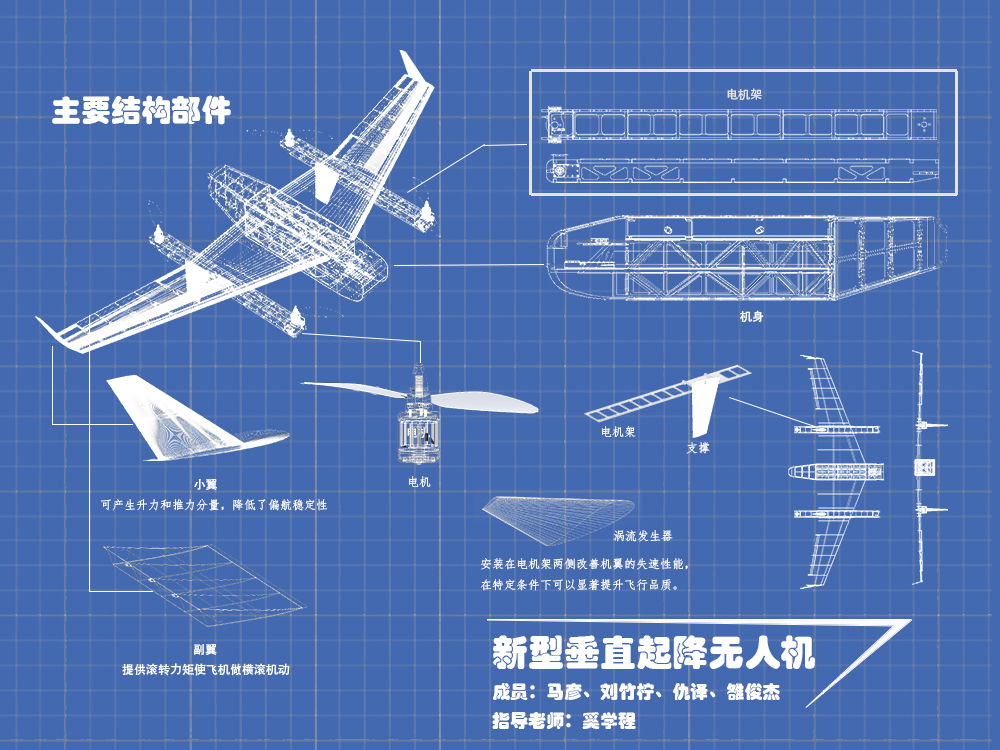 随着无人机技术的不断发展,无人机在影视、工业、农业、公共安全及军事领域得到了广泛应用。现有的无人机主要有多旋翼型、固定翼型、直升机型三种,这些机型的优缺点都比较突出:多旋翼型结构简单、使用灵活,但效率低、续航性能差;固定翼型结构简单、续航性能好,但对起降场地要求高、使用场景有限;直升机型效率高、使用灵活,但结构复杂、制造与维护成本高,以上这些缺点极大地限制了无人机的应用场景。因此,本项目旨在研发一款综合性能强的新型垂直起降无人机,以弥补现有无人机的性能缺陷,为无人机更广阔的应用提供可能。