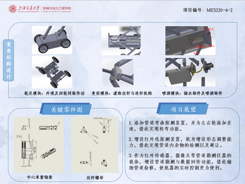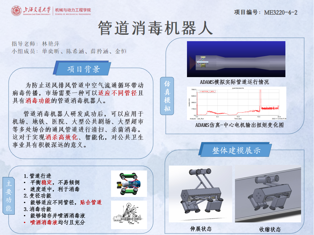 在后疫情时代中,市场对于可以进行高效消杀的自动化机器人有着较大需求,且因送风排风管道中空气的流通循环可能加速病毒传播,市场需要一种可以适应不同管径、具有消毒功能的自动化管道消毒机器人。因此,我们计划设计一款管道机器人,一方面能够在不同管径的管道内实现快速前行、上行等运动的,另一方面可以对不同管径的管道进行均匀有效的消毒,可以大范围适用于写字楼、酒店、商场等人流密集区域的管道消毒工作,对其排风送风系统进行全面消毒,防止病毒病菌的进一步扩散与传播。