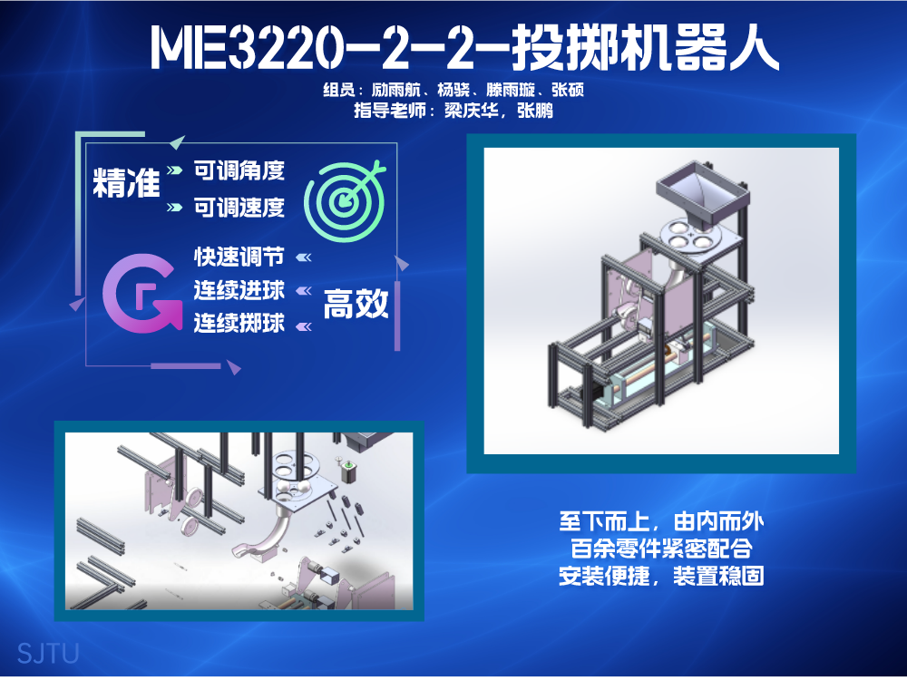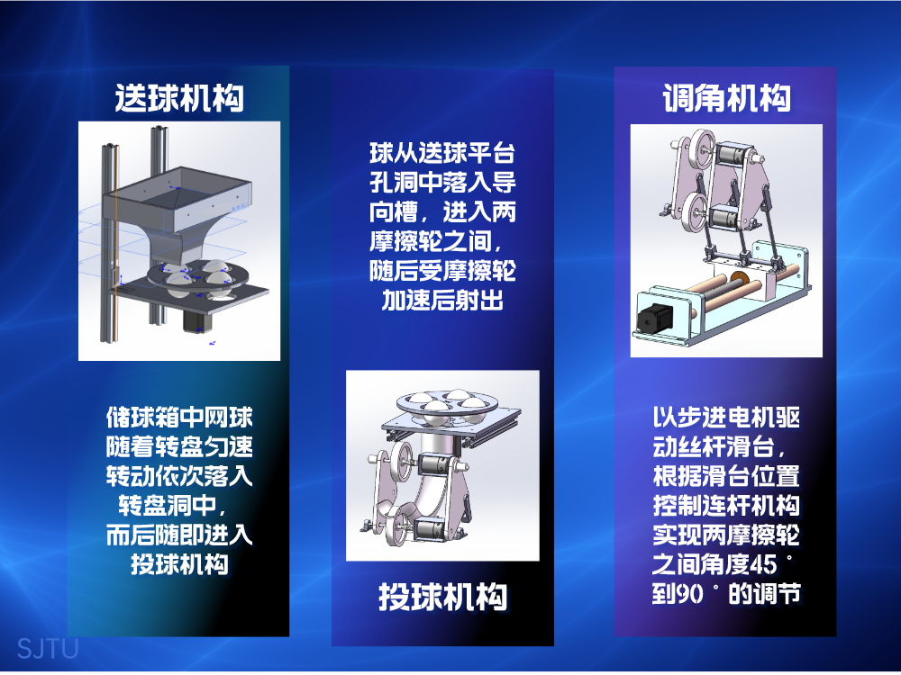 本项目名为“发球机器人”,通过设计机构满足日常生活中网球的投掷,通过摩擦轮配合角度调节机构实现对网球发射角度、速度的调节,能够实现连续快速精准地投掷网球。装置分为送球、角度调节、发射三个部分,各部分之间配合工作。整体体积较小,能够方便移动,而且在不同使用场景下,由于结构稳定性好,装置都能保持正常工作。相比于市场上现有的产品,本项目能够在成本远低于其的条件下实现类似的功能,降低了球类发球机的使用成本。