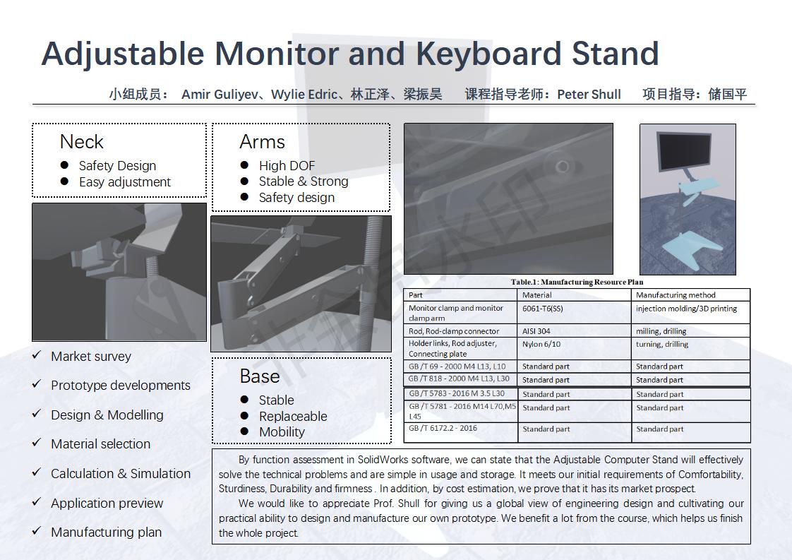 After teamwork throughout the whole semester, we finished all the designing, modeling and optimizing work of our project. By function assessment in SolidWorks software, we can state that the Adjustable Computer Stand will effectively solve the technical problems that the present similar products cannot be horizontally placed in the slope field environment and are single in usage and storage. The final prototype will meet our initial requirements of Comfortability, Sturdiness, Durability and firmness. In addition, by cost estimation, we prove that it has its market prospect. Although we cannot manufacture the prototype in reality, we still list all the assembling and manufacturing methods of different parts in detail considering both cost and performance.