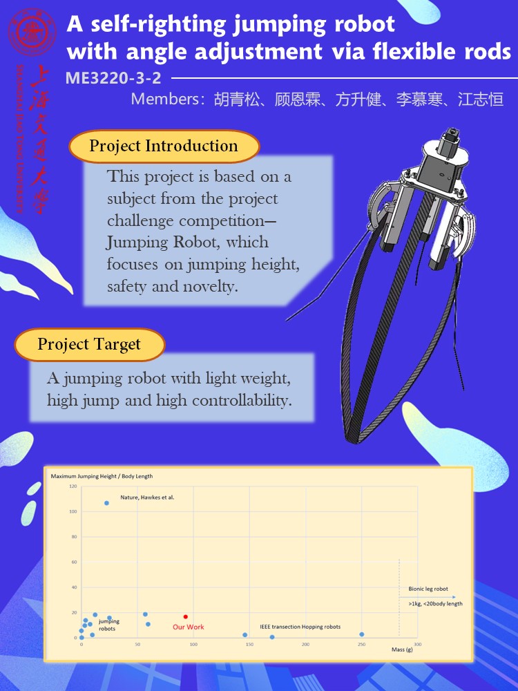 We managed to finish the design in SolidWorks. This robot can perform jumping and has angle adjustment function. The preparation time for jumping is less than 30 seconds. However, the robot cannot repeat the jumping process without human aid. Though we managed to realize the self-righting function, the pull wire system for bending the flexible rods requires human adjustment after each jump.