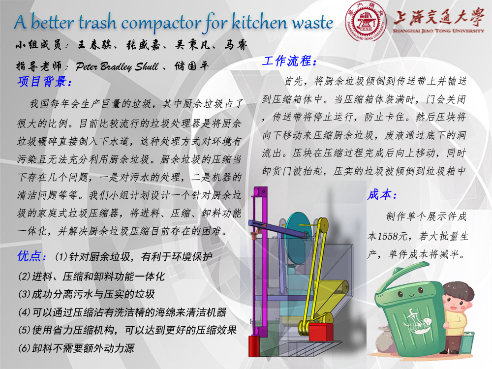 我国每年会生产巨量的垃圾,其中厨余垃圾占了很大的比例。目前比较流行的垃圾处理器是将厨余垃圾碾碎直接倒入下水道,这种处理方式对环境有污染且无法充分利用厨余垃圾。厨余垃圾的压缩当下存在几个问题,一是对污水的处理,二是机器的清洁问题等等。我们小组计划设计一个针对厨余垃圾的家庭式垃圾压缩器,将进料、压缩、卸料功能一体化,并解决厨余垃圾压缩目前存在的困难。