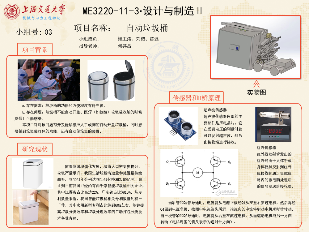 实现了红外传感器对于人手或者遮挡物的检测和电机接受信号后实现自动开盖的功能。我们的超声波传感器可以抗干扰实现检测装满,并在装满垃圾后保持桶盖常开。