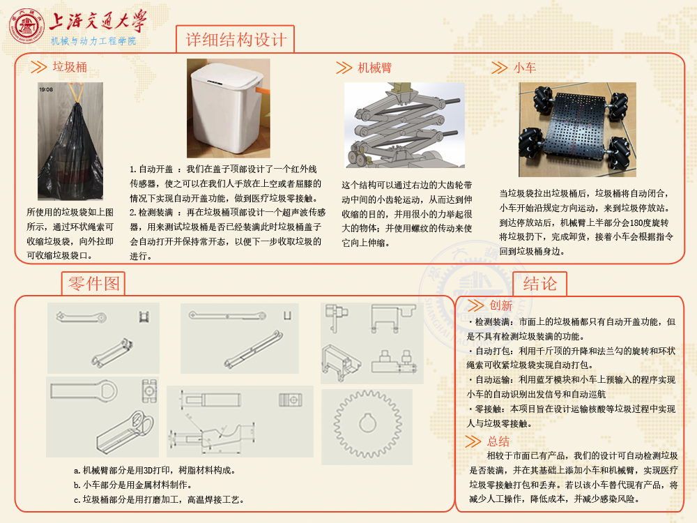 本项目的目标是实现垃圾桶的自动开盖、运输。为了方便医护人员开盖,我们在盖子顶部设计了一个红外线传感器,检测人手,以实现自动开盖功能,此外,我们还于垃圾桶顶部安装一个超声波传感器,用来测试垃圾桶是否已经装满(通过超声波传感器检测的距离,若小于一定的阈值,即认为垃圾桶此时已处于装满状态),垃圾桶装满后垃圾桶盖会保持常开,我们的小车会按照设计的运行程序进行垃圾的自动打包和运输以及卸货,做到医疗垃圾零接触。