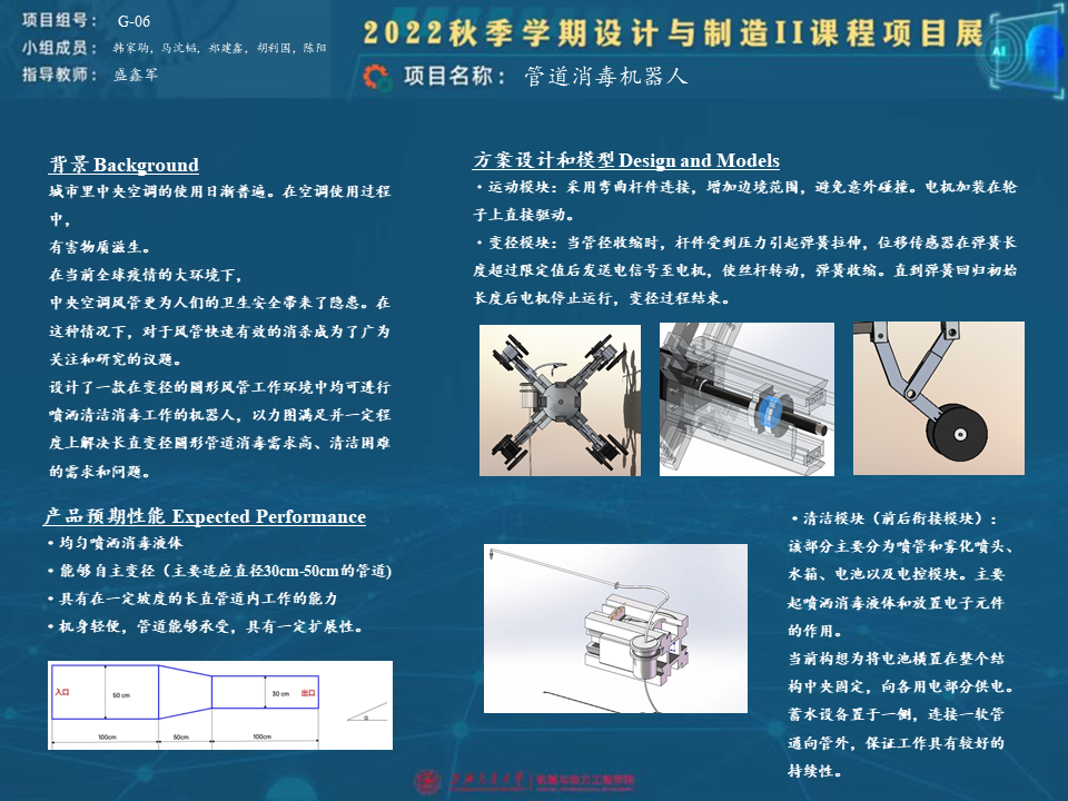 考虑到长直圆形风管的特点:即为了安装和传输考量会产生管径变化,不利于常用管道清洁机器的作业。而且待消毒区域分布均匀,需要机器能够在管壁上实现消毒液体的均匀喷洒。在参考了部分管道机器人的性能后,我们希望项目实现的机器人具有如下功能: