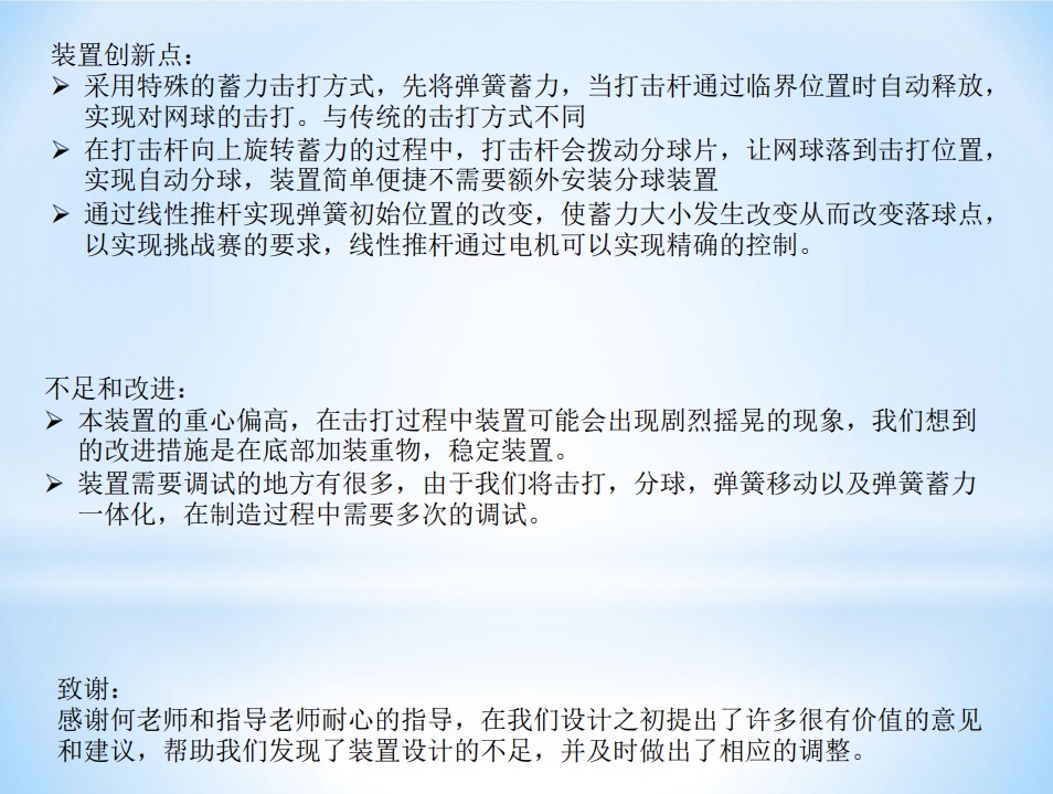 本小组将整个装置分为三个模块,分别为击打模块,控制弹簧伸长量模块,以及分球模块。我们将三个部分调试整合,实现了项目挑战赛的要求,通过控制初始电机转动实现打击杆的蓄力,在完成一次击打后,装置上方的线性电机会向前移动以减少弹簧的伸长量,移动的长度是我们通过实地实验的结果,由于疫情原因我们没能造出实物,但通过动画模拟,我们的装置能够稳定的准确的将网球投入指定的区域内,同时本装置还不同于一般的击打方式,满足了项目挑战赛创新性的要求。