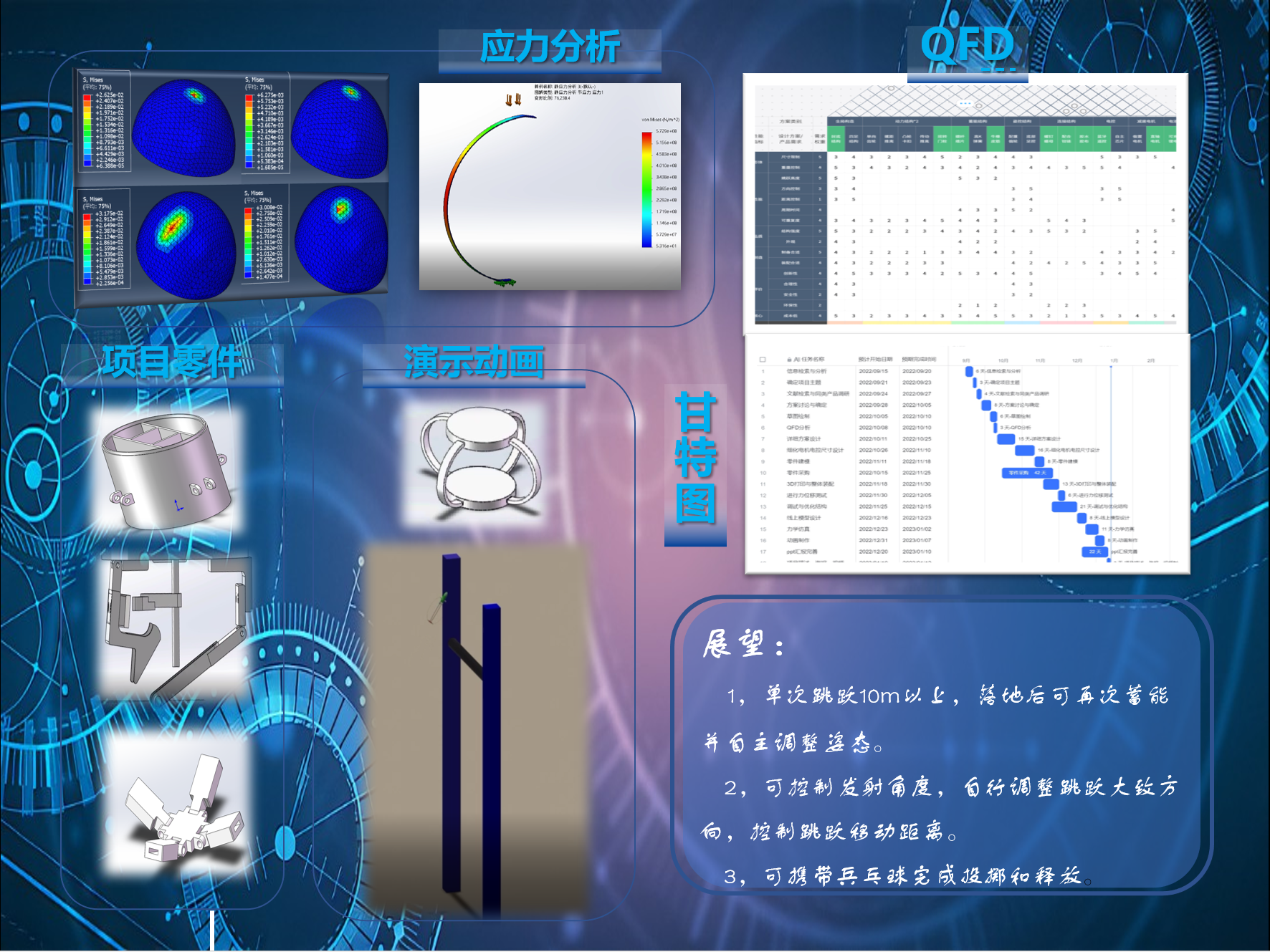 该机器通过力学和运动结构优化,理论上拥有极高的跳跃性能。在30秒内通过完成长时间蓄力,机器立起,调整方向,机构释放,起跳,坠落等动作行为可实现垂直跳跃至少1.5m高度的设计指标。