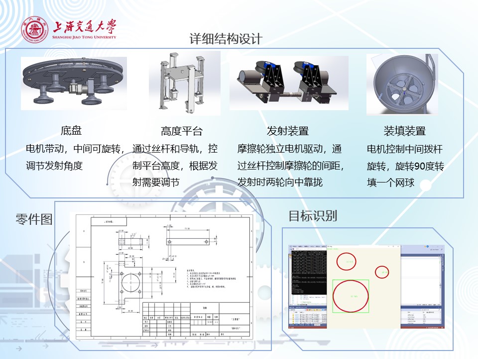 我们设计的网球投掷机器人可将网球依次投入大小不同的目标区域,同时可在一定时间内完成投掷,且投掷范围有一定的精度,总体需要完成四个动作,捕获,调整,装填和发射。通过摄像头捕获目标信息,采集投掷目标位置,利用机械机构控制调整发射角度和高度,通过旋转漏斗的结构完成装填,最后,通过摩擦轮发射网球到指定目标位置。