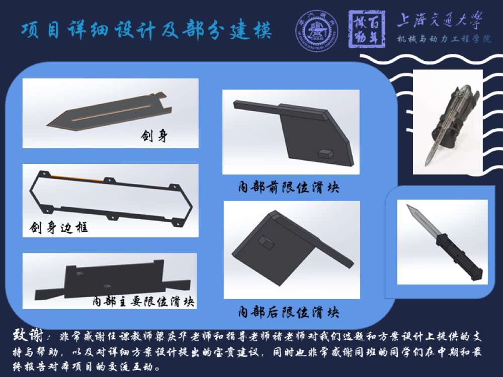 对所有零件进行了建模并且将零件都组装成了整体并实现了上述功能。其中主体使用了弹簧作为快速移动的主要驱动力,物品可以在1秒之内弹出和收回;平移功能使用丝杆进行平滑位移;转动功能使用四杆机构实现。整个机构的重量在500g左右,基本实现了轻便的目标。并且我们将模型进行仿真分析后发现模型在振动和不同角度下仍然可以保证结构的稳定。并且主体只有在一定程度的受力下才会实现内部物品的弹出。这些都表明在日常的活动中此装置是绝对安全稳固的,并不会对人造成伤害。