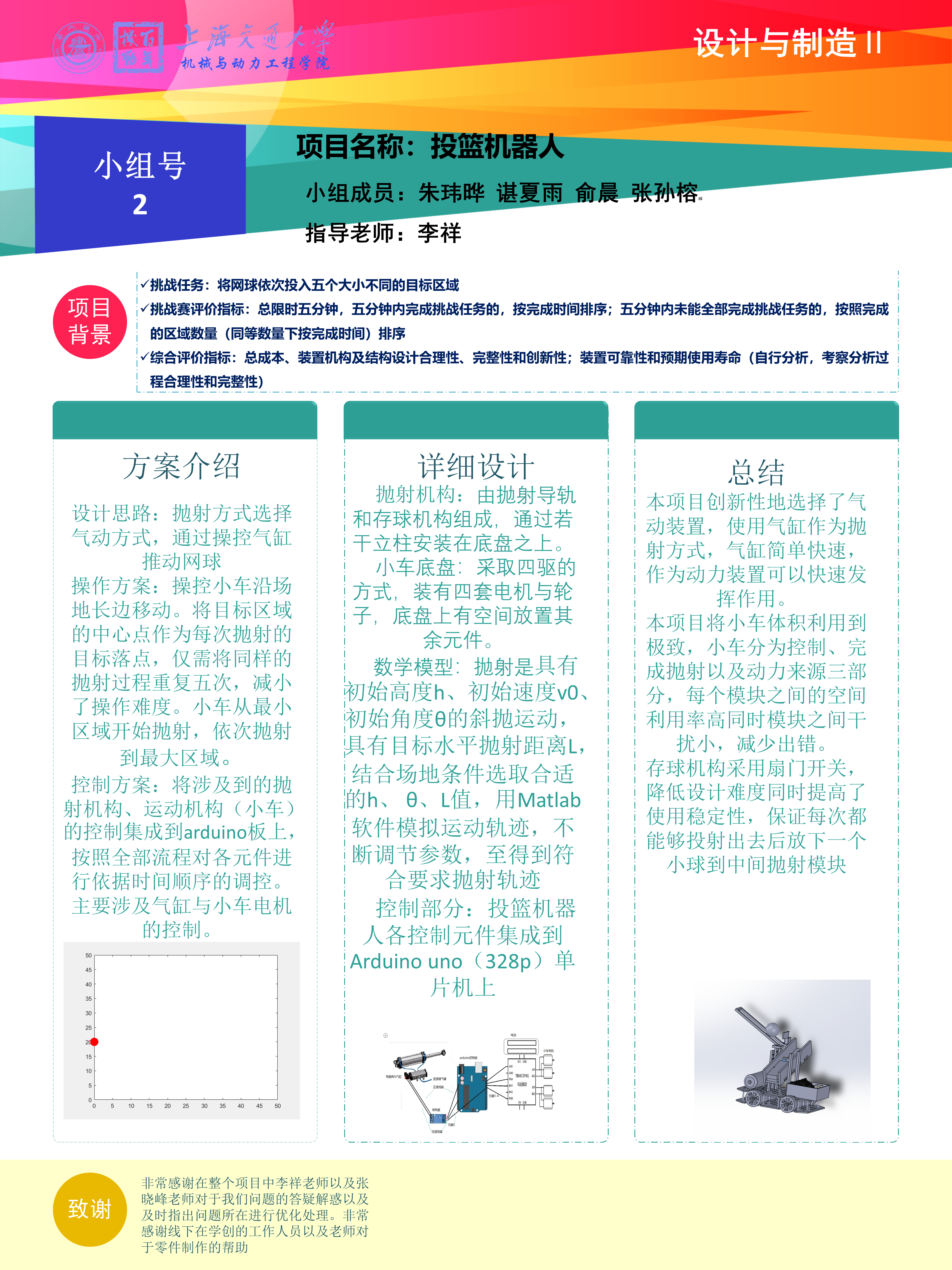 本作品模型分为投掷机构与小车底盘两部分。使用气缸作为投掷的动力元件,配合其他机构组成投掷机构,投掷机构旁设置了相应的网球存储结构;小车底盘设置了四个轮子与电机以完成直线运动,并使用蓝牙模块实现实时调整。我们通过建立网球从投掷机构中投出的轨迹数学模型,得到了具体的投掷的相关参数,理论上达到了将网球投入目标区域的要求。同时建立了整个投篮机器人的控制系统,编写了程序。投篮机器人的运行过程为:先将机器人放置在初始位置进行第一次抛射,抛射完毕后气缸复位,存球机构下放下一个小球,小车移动到下一个发射点位,以此类推。
