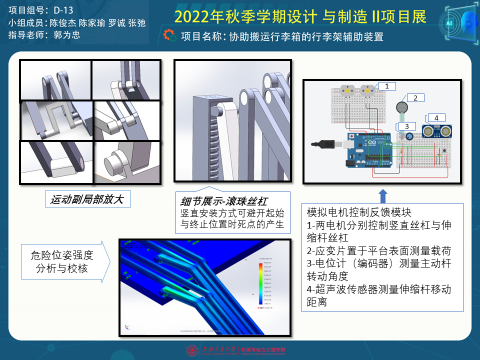 本项目成功实现了立项要求的:在控制下,将最大负载不超过20Kg的行李箱,按照设计好的、不与周围相干涉的运动轨迹安全运动。在结构上,我们详细设计并校核了(包括单独校核与综合仿真)各个零件与运动副的选型、尺寸、材料、配合,并绘制了制造零件与装配体的工程图;在运动控制上,我们规划了机构运动的流程图,对主动驱动元件与供电方式进行了计算与选型,明确了各组传感器的要求、选型与工作逻辑网络,并线上组装了一则面向用户使用的、安全稳定的控制电路,虚拟实现了利用用户输入控制机构按要求运动,并在各种意外情况下的自动保护,完成了项目的要求。