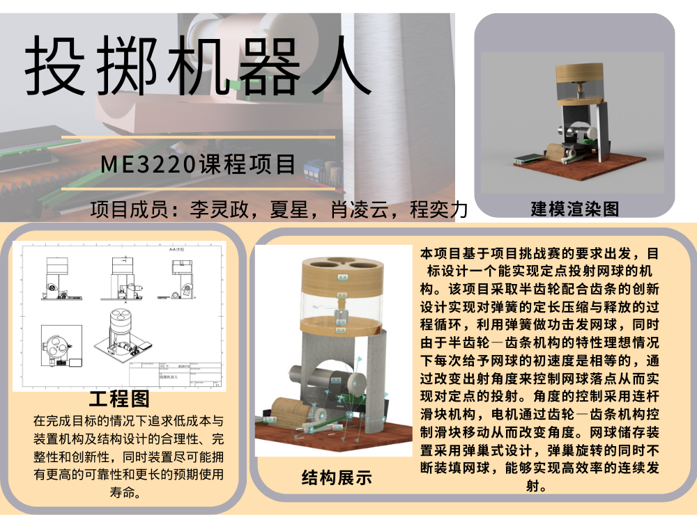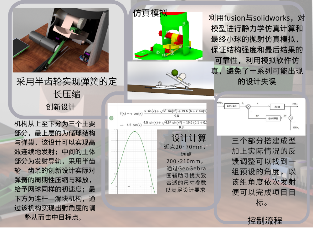 本项目基于项目挑战赛的要求出发,目标设计一个能实现定点投射网球的机构。该项目采取半齿轮配合齿条的创新设计实现对弹簧的定长压缩与释放的过程循环,利用弹簧做功击发网球,同时由于半齿轮—齿条机构的特性理想情况下每次给予网球的初速度是相等的,通过改变出射角度来控制网球落点从而实现对定点的投射。角度的控制采用连杆滑块机构,电机通过齿轮—齿条机构控制滑块移动从而改变角度。网球储存装置采用弹巢式设计,弹巢旋转的同时不断装填网球,能够实现高效率的连续发射。