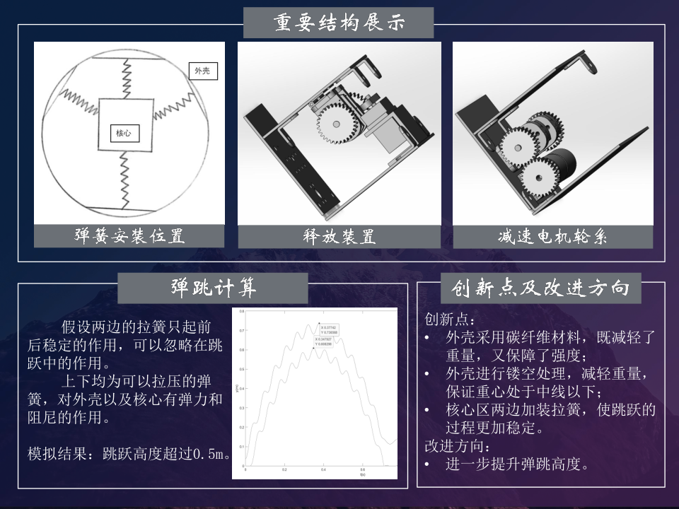项目目标为了适应挑战赛的需要,我们确保机器人具有一定的跳跃高度;同时,由于机器人需要连续做功,为了保证跳跃的连续性,我们需要保证两次跳跃间隔不超过30秒。同时,为了能够确定机器人的方位,我们必须要求可以控制跳跃方向和落点。我们还需要保证经济性,保证机器人的质量,使其可以多次跳跃而不损坏。最后要求操作方便,可以通过简单的电控和机械结构达成目的。