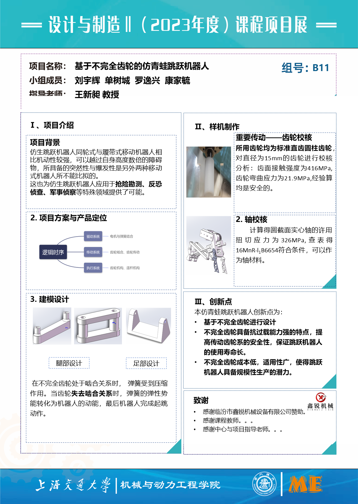 仿生青蛙跳跃机器人基于不完全齿轮传动进行跳跃行为,同轮式与履带式移动机器人相比机动性较强,可以越过自身高度数倍的障碍物,这也为仿生跳跃机器人应用于抢险勘测、反恐侦查、军事侦察等特殊领域提供了可能。