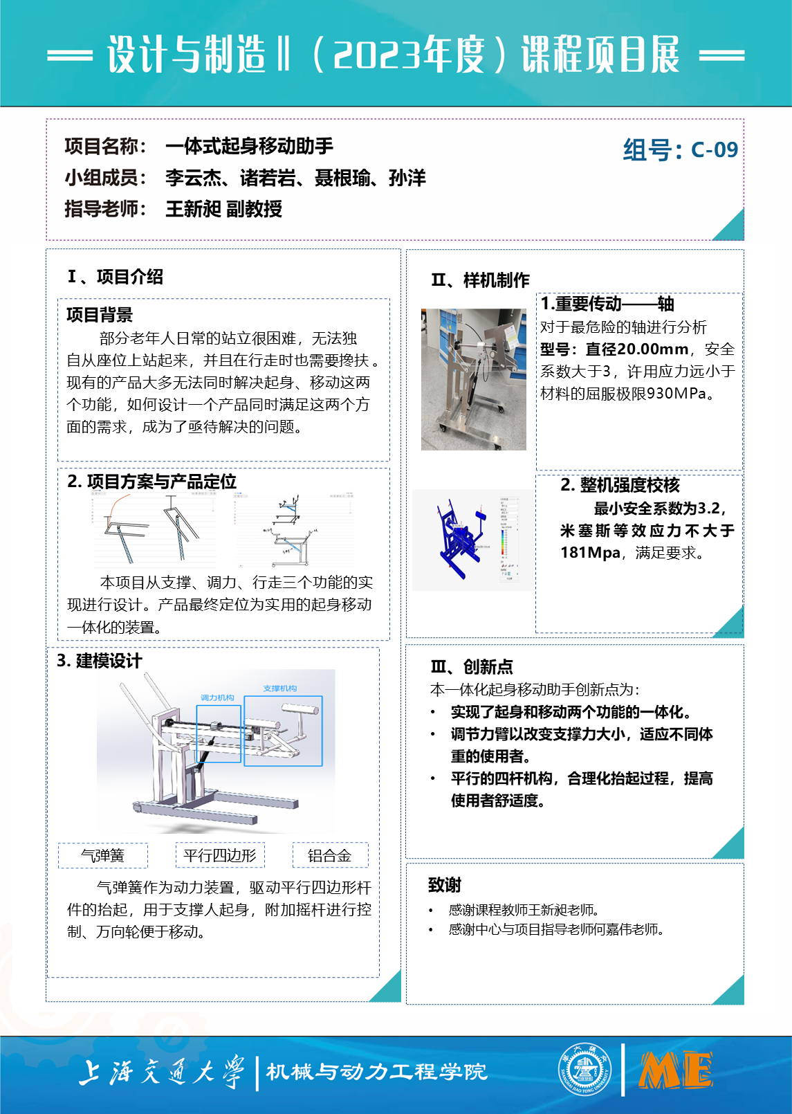 产品验证可实现项目预期功能,能够满足起身困难、行走不便者的需求。同时产品设计结构清晰、原理易懂,生产流程简单。但现有产品仍有许多不足之处需要修改,如支撑材料可以换成铝制,丝杠长度需要加大等等。