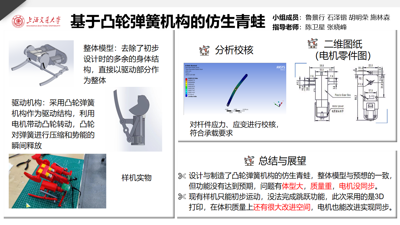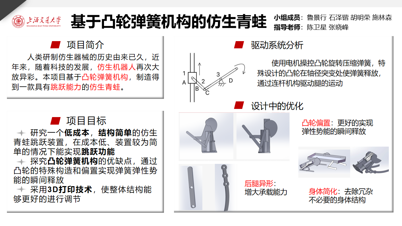 仿生青蛙就是一种能在多样环境中作业的机器人。青蛙是两栖动物,具有优异的跳跃、游泳能力。跳跃使仿生青蛙具有良好的越障能力,而游泳能使仿生青蛙在水中灵活地活动,即仿生青蛙在多种环境中都具有良好的运动能力。因而在上述探索、救援等工作中都能起到良好的效果。本项目意在开发一种基于凸轮弹簧机构的仿生青蛙,能在较低成本下达到跳跃的基本功能。