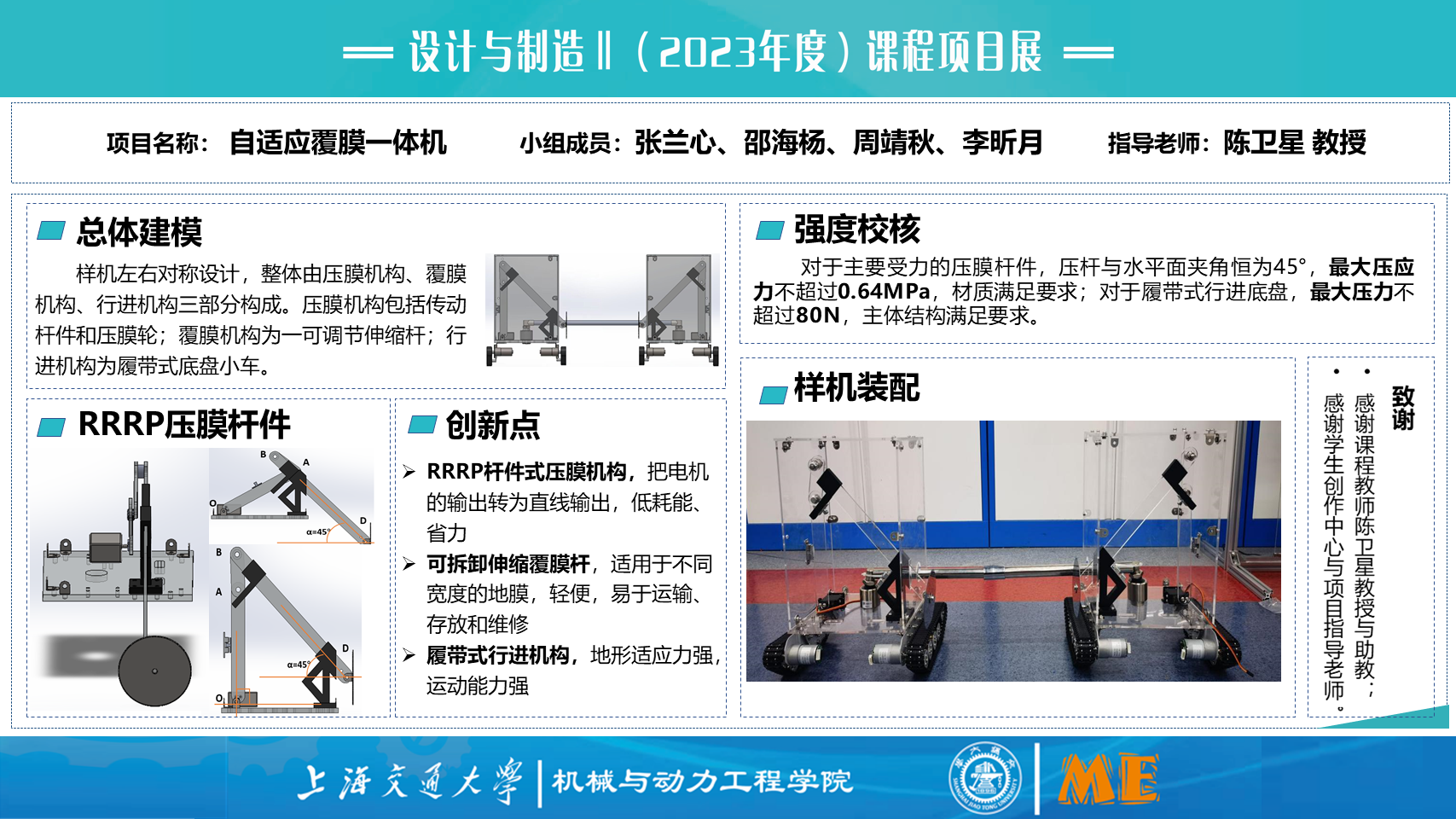 覆膜种植是我国农业生产的一大特色,且技术已经在我国大多数地区广泛推广。考虑到现有的覆膜机械不能针对性解决我国小规模农户在覆膜上费时耗力的问题,本项目组决定设计一款轻小自动、廉价简便、适应性强的覆膜一体机。该项目采用履带式行进装置以适应多种土质,自主设计了RRRP压膜杆件实现压膜深度和安全力度的可调节,并通过蓝牙模块实现两辆履带小车之间的通信与配合。
