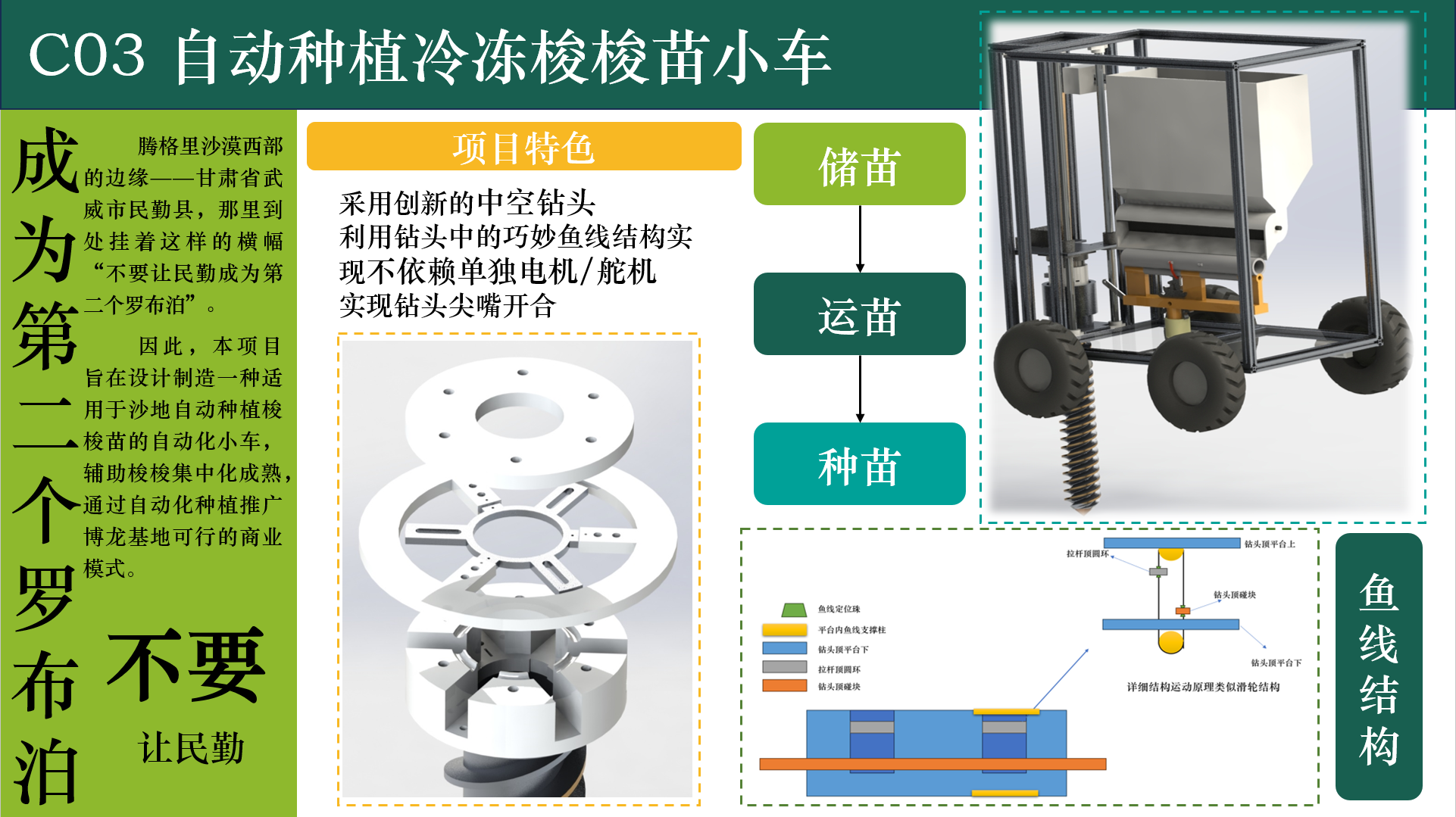 本项目旨在设计制造一种适用于沙地自动种植梭梭苗的自动化小车,辅助梭梭集中化成熟,通过自动化种植推广甘肃-博龙基地可行的商业模式。我们使用各种机械机构来实现我们所需的功能,为了突出这学期课程学习的重点,我们尽可能少地使用电机或舵机驱动,设计一些纯机械结构来实现一些功能。