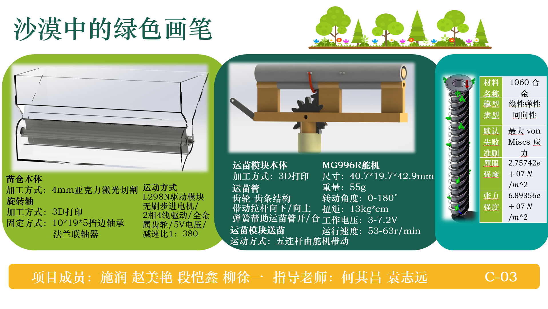 我们最终完成了所有得机械结构,电控方面由于时间不足,没有调试得很完美,我们后续会继续完善这个项目。我们也实现了不使用单独的电机或舵机就可以完成运苗模块中运苗管的开合以及钻头尖嘴的开合,使得苗可以在较深的深度被种下,防止沙土回陷,提高梭梭苗的成活率。