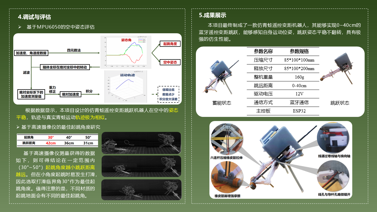项目设计了一款仿青蛙跳跃机器人,能够实现0-47cm遥控变距跳跃;跳跃过程中机器人姿态平稳,无明显翻倒现象;机器人整体形态与青蛙非常相似,仿生性强;通过MPU6050、自建静态力测量平台和高速摄像仪实现对机器人跳跃位姿的智能感知,并辅助机器人的设计和调试。