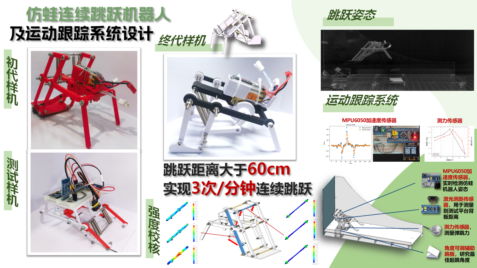 此外,我们还搭建了一套测试系统,分为机载测试平台(包括TOF激光测距传感器、MPU6050加速度传感器)和固定测试平台(包括力传感器和辅助跳板)。通过多传感器检测仿生青蛙全过程的运动相关参数,用以指导机构几何尺寸、力学性能和控制参量的优化。