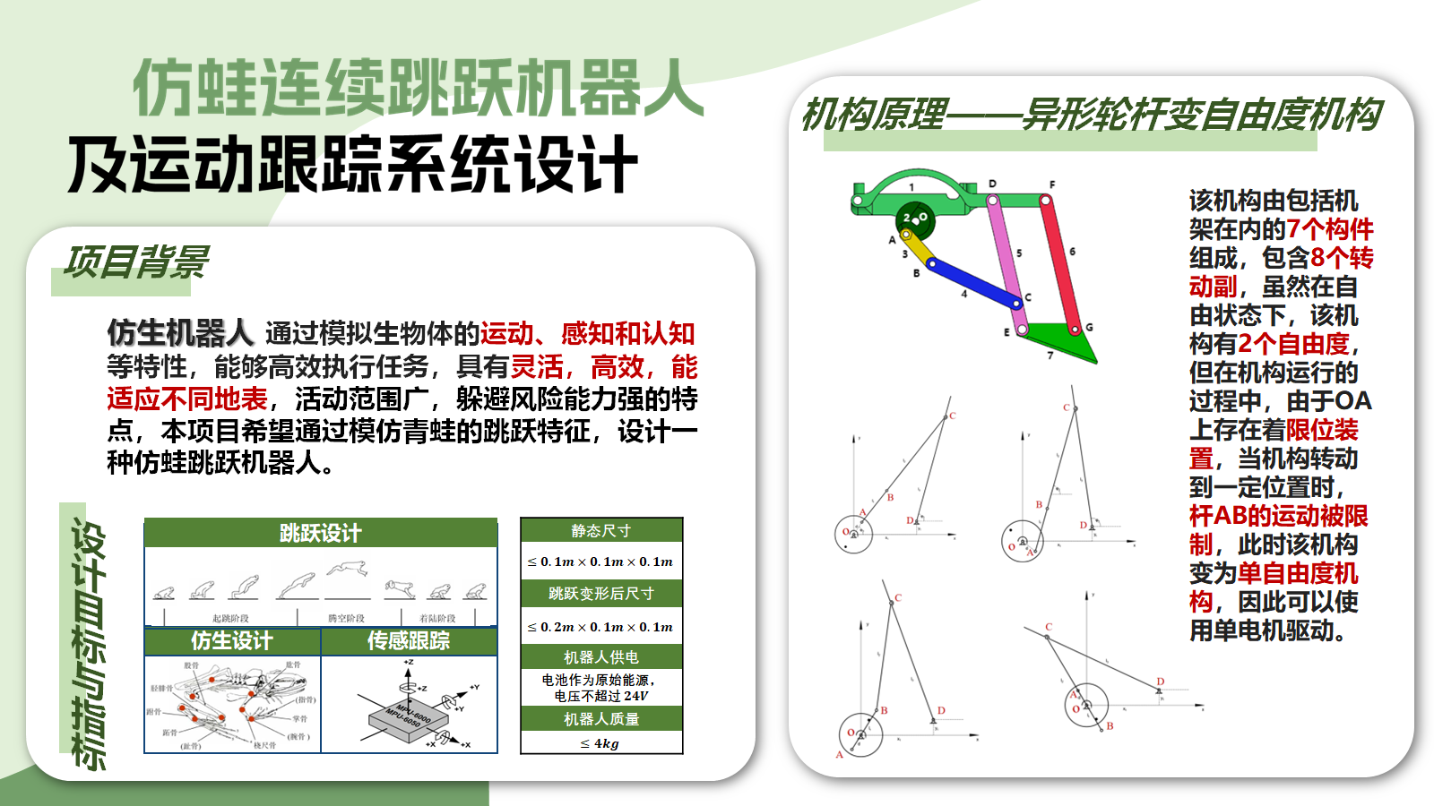 (1)高度仿蛙的机械结构与运动方式: 成功设计出与青蛙高度相似的跳跃机器人的轻量且稳定的机械结构,模仿青蛙蓄力、跳跃、姿态调整的运动方式;