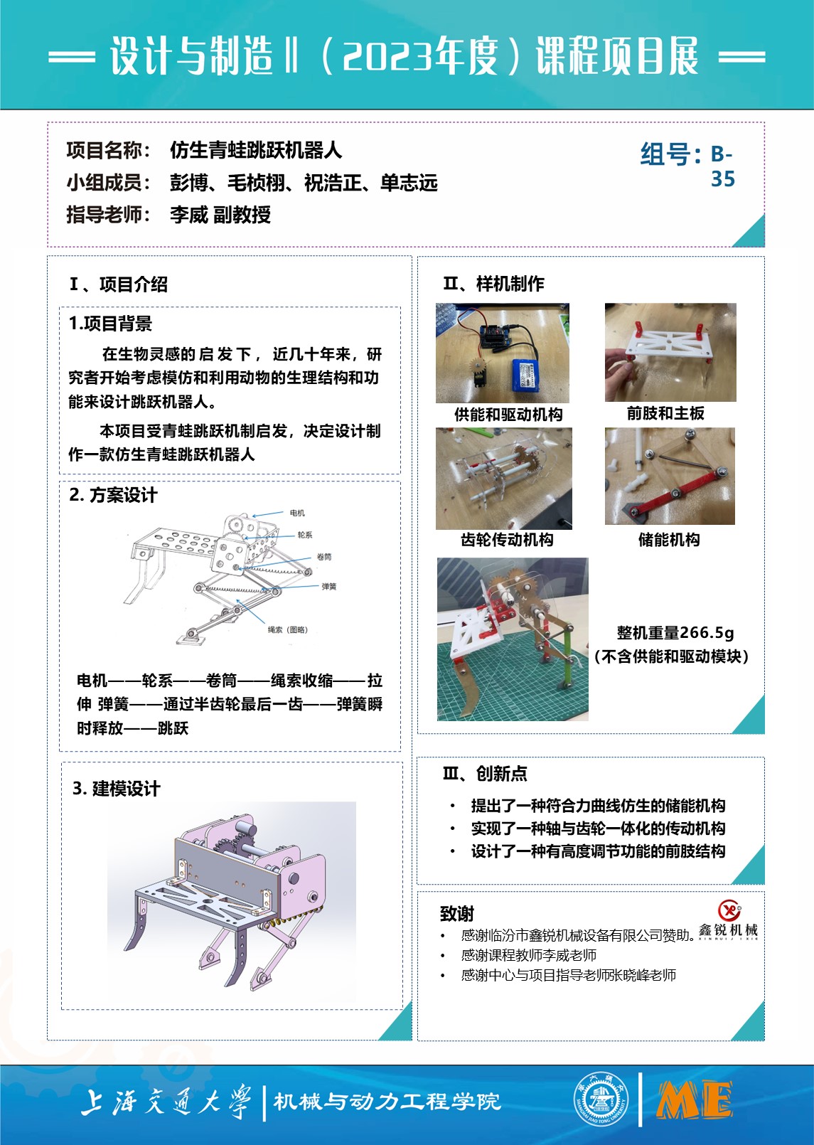 仿生机器人是依据仿生学原理,模仿生物结构、运动特性等设计的机电系统,本项目模仿和利用青蛙的生理结构和功能来设计一种跳跃机器人,以跳远距离为指标,并实现起跳与落地阶段的姿态稳定。