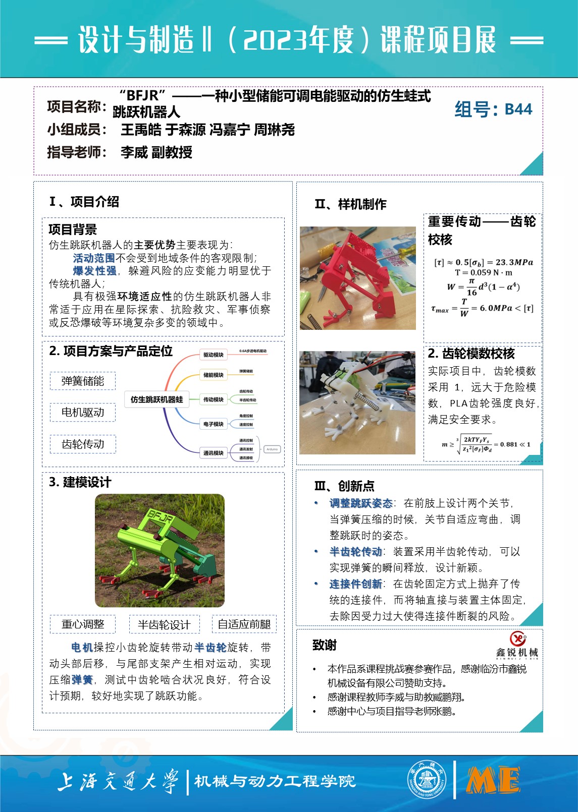 仿生跳跃青蛙机器人作为常见的跳跃机器人,其亦有着灵活的应用场景。本项目为目标参加比赛的仿生跳跃式机器人,依靠电能驱动电机,并通过弹簧实现储能,短时间释放从而实现跳跃。