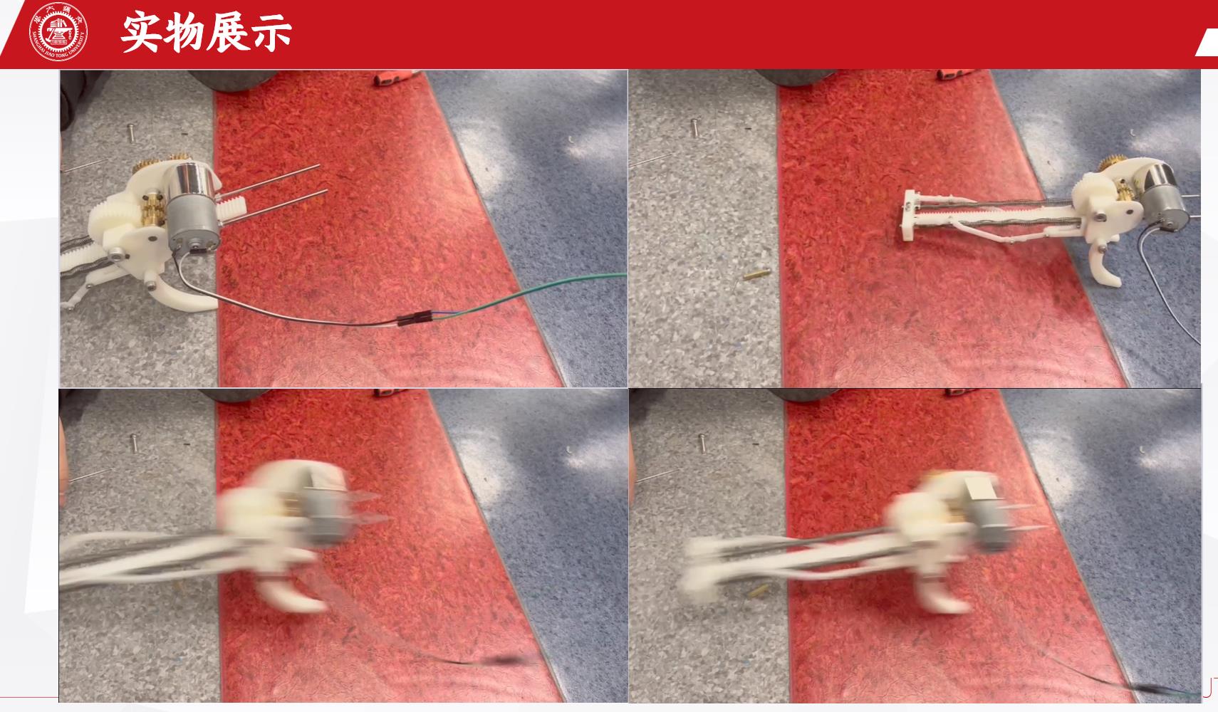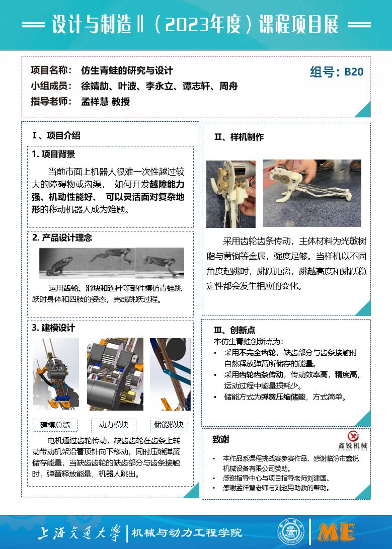 通过动力模块、储能模块、电控模块间的相互配合,初步成功实现了仿生青蛙机器人的设计:电机通过齿轮传动,缺齿齿轮在齿条上转动带动机架沿着顶针向下移动,同时压缩弹簧储存能量,当缺齿齿轮的缺齿部分与齿条接触时,弹簧释放能量,机器人跳出。整体与青蛙较为类似。