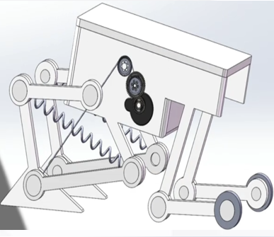 前服杆件的关节处都添加扭备以增大弹性势能以及发挥缓冲作用,前腿着地处采用滚轮结构来降低失稳的可能,